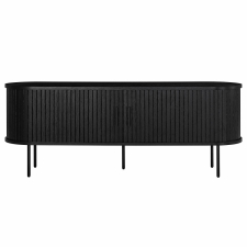 Questo elegante mobile TV Midnatt di dimensioni 150x40x55 cm combina un design moderno con un'archiviazione funzionale e diventa un elemento elegante nel tuo soggiorno. Realizzato in MDF e impiallacciatura in rovere americano di alta qualità e dotato di porte scorrevoli a loop nere, offre un equilibrio armonioso tra calore naturale e contrasti eleganti. Le gambe in metallo verniciato a polvere nero non solo forniscono una costruzione stabile, ma rafforzano anche il design sofisticato e drammatico.